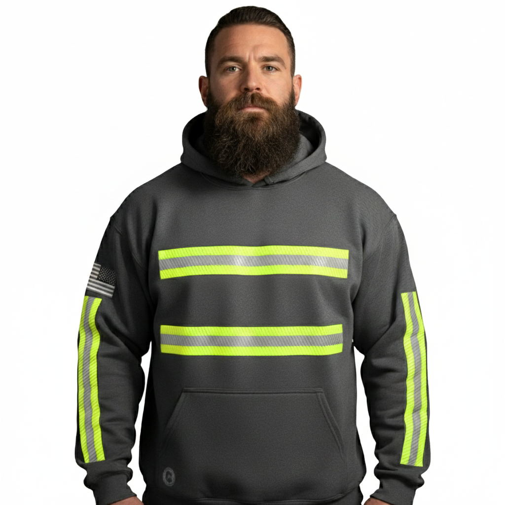Grey Reflective Hooded Sweatshirt with Hi Vis Yellow Strips, ANSI Class 2 (NO LOGO) (Gen2)