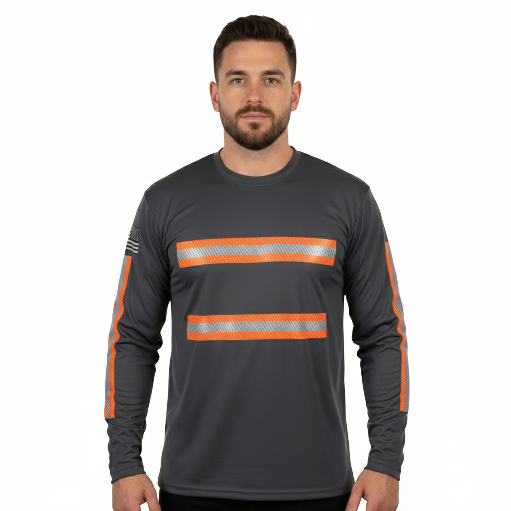 ANSI Class 2 Grey Reflective Long Sleeve Safety Shirt w/ Hi Vis Orange Strips (NO LOGO) (Gen2)
