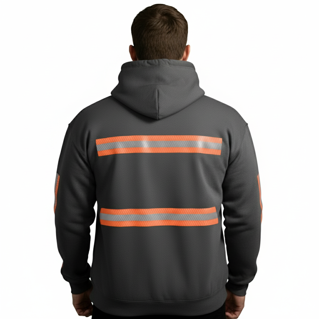 Grey Reflective Hooded Sweatshirt with Hi Vis Orange Strips, ANSI Class 2 (NO LOGO) (Gen2)
