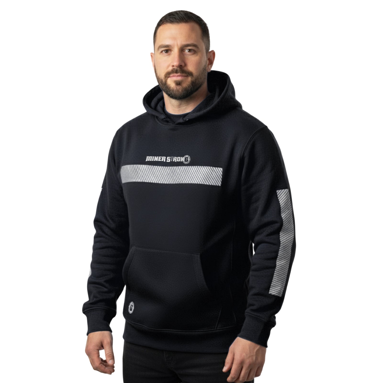 The ANSI Class 1 Grey MSG 2017 Skull Hoodie is engineered for high visibility, featuring extensive reflective elements for safety on the job. The front is detailed with a reflective "Miner Strong Logo" and a reflective strip across the chest. Both sleeves include additional reflective strips, with the right sleeve uniquely showcasing a reflective USA Flag.